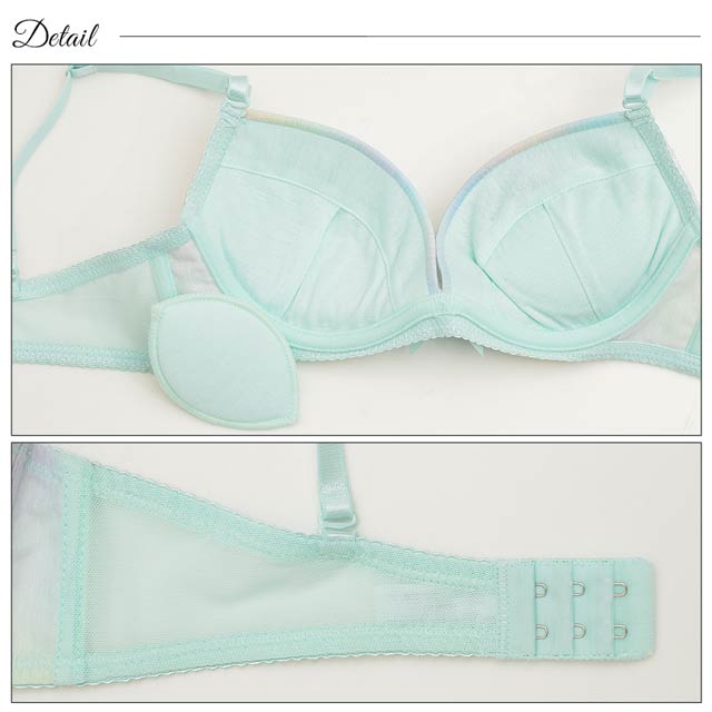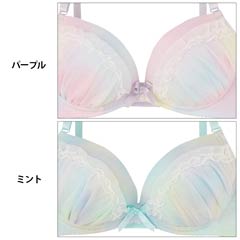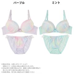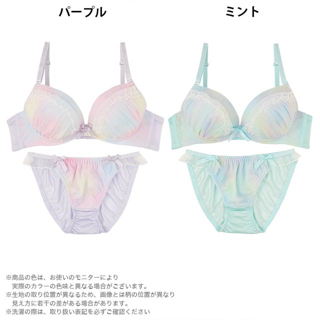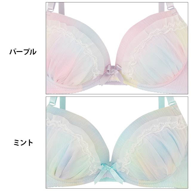 まるで夢の中にいるようなキラキラ煌めくラメ入りのパステルグラデーションが乙女心をくすぐる"ゆめかわ"ランジェリー♪カップはたっぷり寄せたギャザー&フリル付きなので、胸に自信がない子でも身に着けるだけで簡単にボリュームのあるバストが実現♪ショーツは両サイドにリボンを飾ってとことんCuteに♪素肌が透けるレースラインで腰回りに色っぽさをプラス♪"カワイイ"を追求する女の子にピッタリのランジェリーです♪