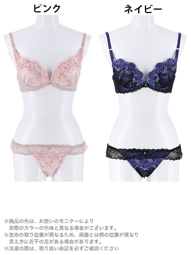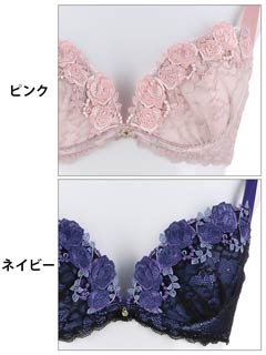 刺繍ランジェリー。薔薇刺繍のアーチで谷間に飾り、きめ細やかなコードレースで全体を包み込みこんだエレガントデザイン。