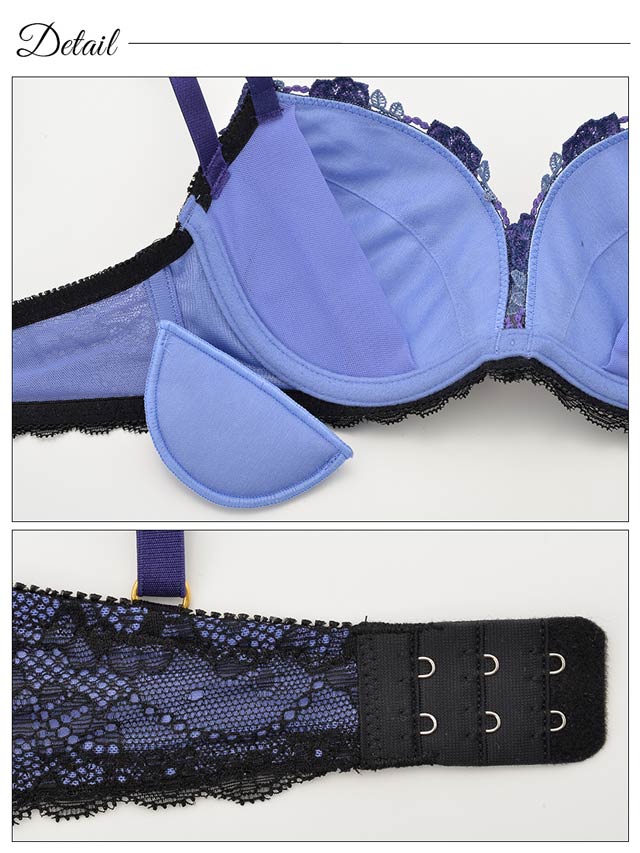 三角ストラップで横流れした胸をバストへ戻し、三日月パッドでしっかりバストを寄せ上げてセクシーな谷間を演出します。
