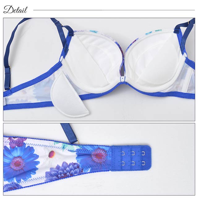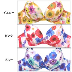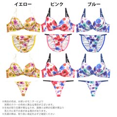 伸縮性のあるストレッチ生地にカラフルな花柄プリントが目立つブラセット。ブラジャーは下厚の内蔵パッドと取り外し可能な三日月パッドのダブル構造で、バストを劇的にボリュームアップ♪さらにトライアングルストラップが脇のお肉を胸に寄せてくれるので、簡単にむっちりバストが完成します。フルバックもTバックもサイドは1本ラインで腰周りをスッキリと魅せてくれます。カラバリはイエロー・ピンク・ブルーの3種類。派手好きさんにオススメ◎明るい気分になれるランジェリーです♪