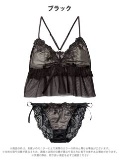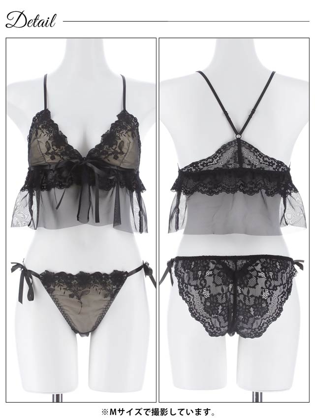 • 2/4新作!【ノンワイヤー】フェアリーフルールレーシィブラジャー&サイド紐バック透けフルバックショーツ[大人気](ブラック-S)