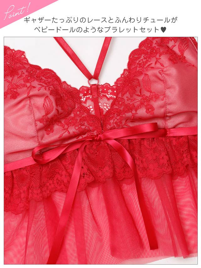 セクシーさと可愛さを兼ね備えたデザインが乙女心をくすぐるランジェリー。たっぷりとあしらわれたチュール&レースや、ショーツサイドのほどけるリボンがポイント!フロントホック仕様で着脱しやすく、締め付け感のないノンワイヤーなので着け心地も快適です◎