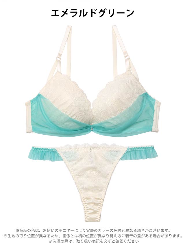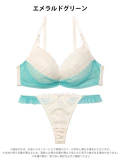 上品なレースのカップに鮮やかなチュールをふんわりと重ねたランジェリー。リボンのようなチュールデザインと、きらりと輝くラインストーンチャームが可憐なアクセントに。ショーツのサイドにはチュールフリルをあしらい、ほんのり甘く女の子らしい雰囲気を演出します。