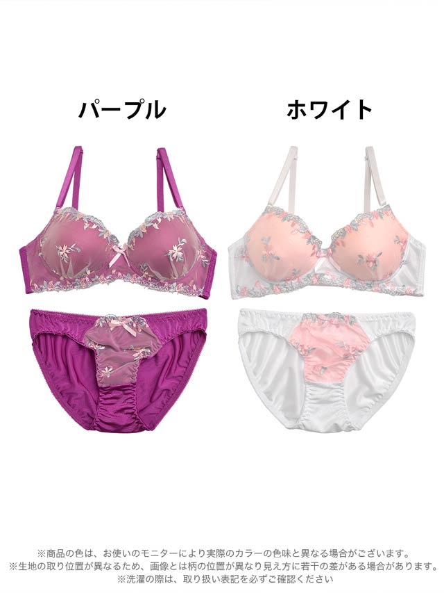【ノンワイヤー】リボンフラワー刺繍チュールブラジャー&フルバックショーツ