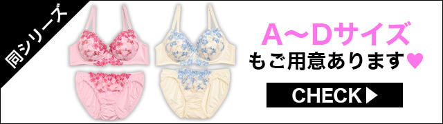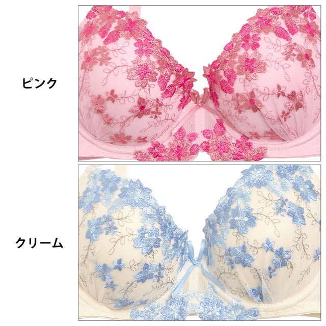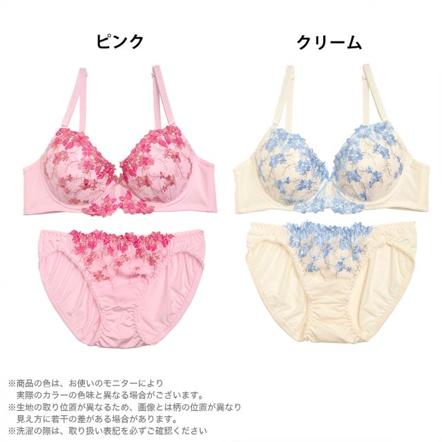 3色の糸でカップいっぱいに施したフラワー刺繍のブラセット。あふれるフラワー刺繍のデザインがが贅沢。華奢なサテンサテンリボンをあしらい、可憐な印象に。おそろいのショーツも履きやすいストレッチ仕様着で機能性も◎