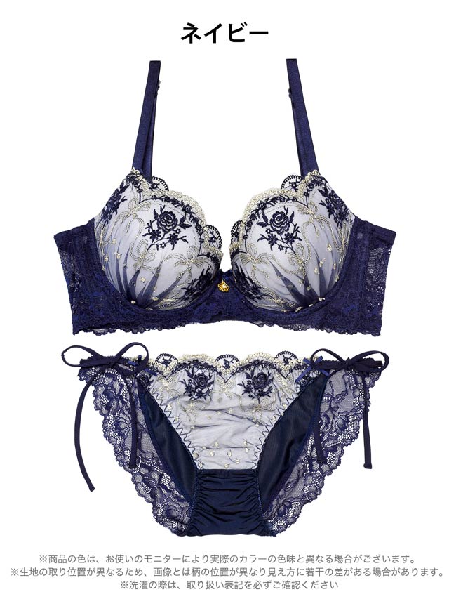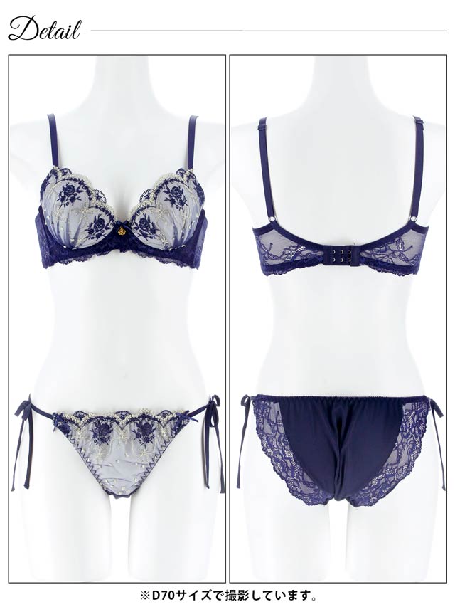 薔薇とリボンを組み合わせたブーケのような刺繍を施したラグジュアリーなランジェリー。胸元にはさりげなくゴールドチャームを添えて上品さをプラスしました♪セットのショーツは解けるサイド紐仕様で、特別な日にも映える色っぽいデザインです!