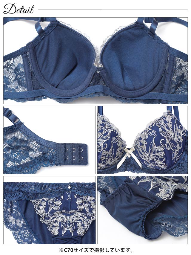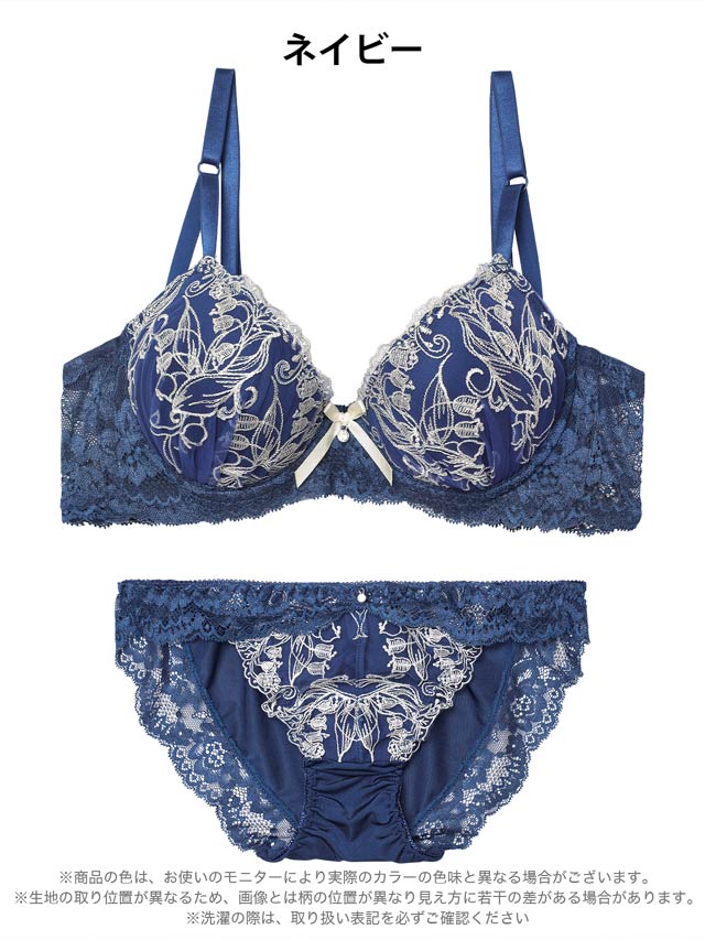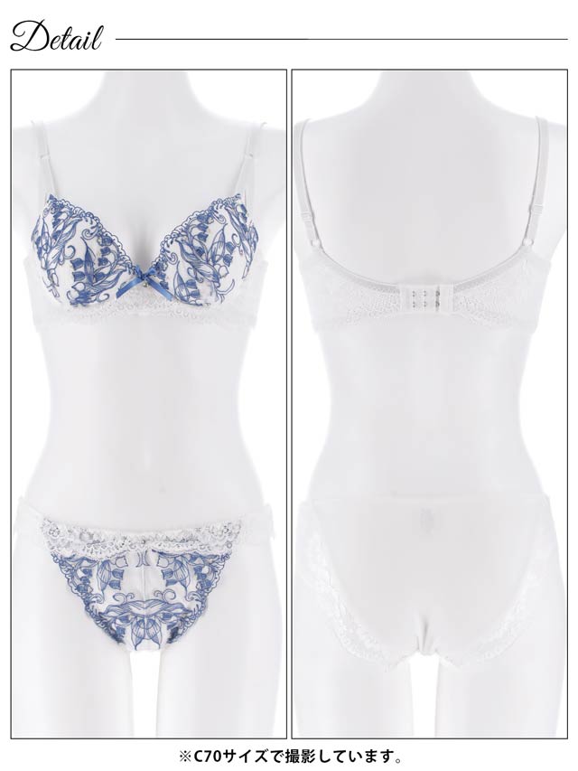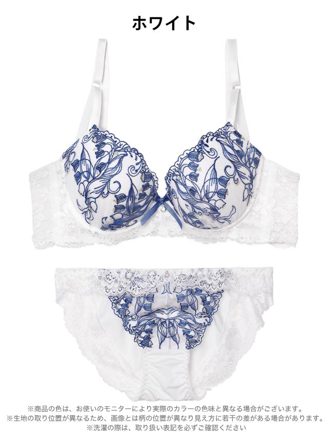 すずらんの花の刺繍をふんだんに施したエレガントなデザインのランジェリー。胸元にはリボンときらめくチャームをあしらい、上品な可愛らしさを演出します♪セットのフルバックショーツは脚口レース仕上げで、肌あたりが優しく履き心地も快適です◎