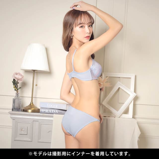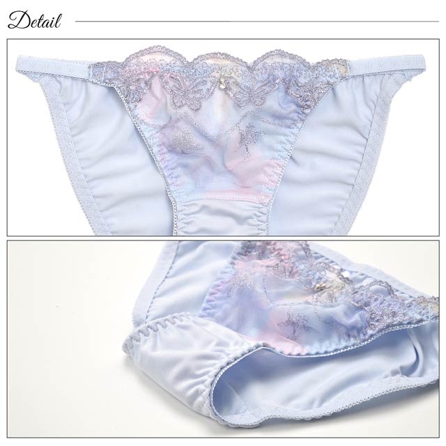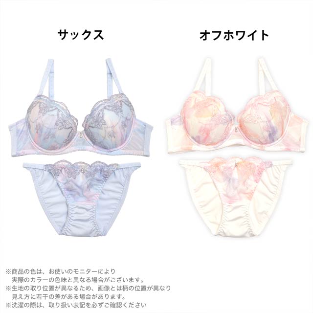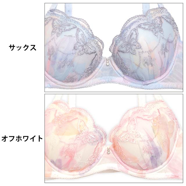 色鮮やかなオーロラ模様のカップにバタフライ刺?を施した個性溢れるランジェリー。被らないデザイン性が目を引くアピールポイント♪ 女の子らしいパステル調な色味とフロントのチャームが華やかな印象に◎