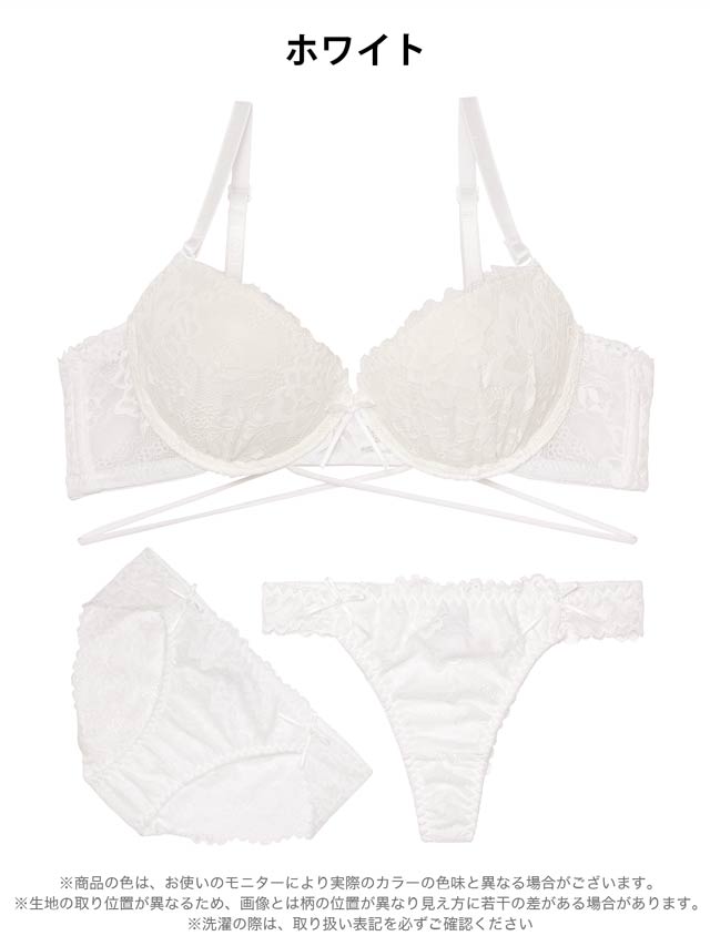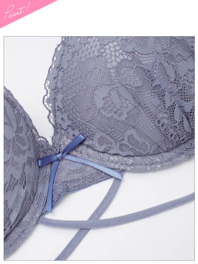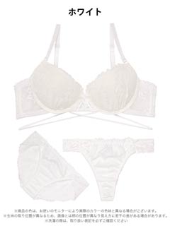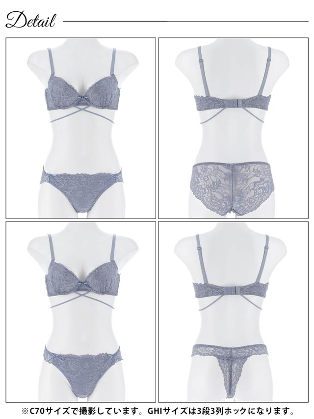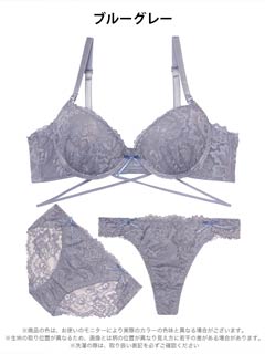 繊細な総レースデザインにクロスコードがセクシーなランジェリー。セクシー寄りのデザインですが小さなリボンがほんのり甘さをプラスします。3点セットなのでその日の気分に合わせてショーツを選べるのも魅力的です◎