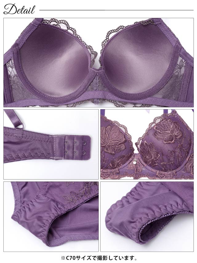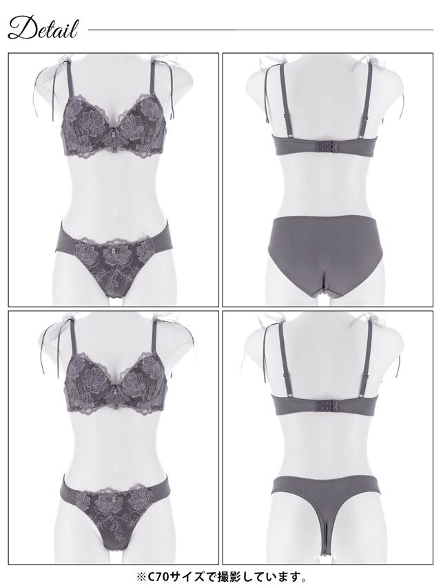 深みのあるカラーに大輪のフラワー刺繍を贅沢にあしらったランジェリー。カップ上辺やアンダー部分にはスカラップレースを施し、細部まで上品な仕上がりに◎ 肩紐には華奢なチュールリボンをプラスし後ろ姿まで可愛らしさを堪能できる1着です。