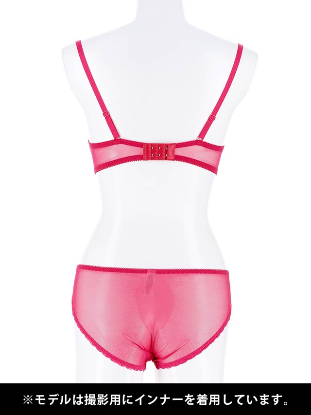 バック透けのショーツはストレッチの効いたシアー感のあるパワーネット仕立てで、色っぽい後ろ姿に演出。見た目にも着心地にもこだわりたい方必見の一着です。