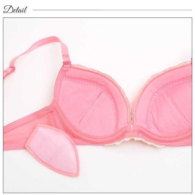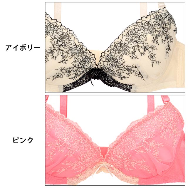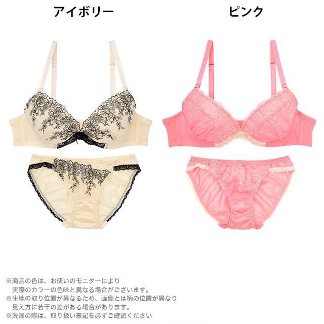 チュールに小花柄刺繍を細部まで丁寧にあしらった、こだわり溢れるブラセット。ブラジャーにはソフトワイヤーが入っているので、アンダーが締め付けられずに快適に過ごせます!ブラジャーのカップは立体裁断となっており、ナチュラルな形のバストに見せてくれます。色はアイボリーとピンクの2種類で、両方とも欲しくなるようなレトロ可愛いデザインのランジェリーです♪