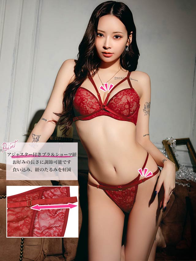 繊細なレースと大胆なコードデザインが視線を惹きつけるセクシーさ満載のランジェリー。コード部分にはアジャスター付きなので、お好みのフィット感に調節できるのも嬉しいポイント。ショーツはバック透けレース仕様で、後ろ姿まで色っぽく仕上げました♪