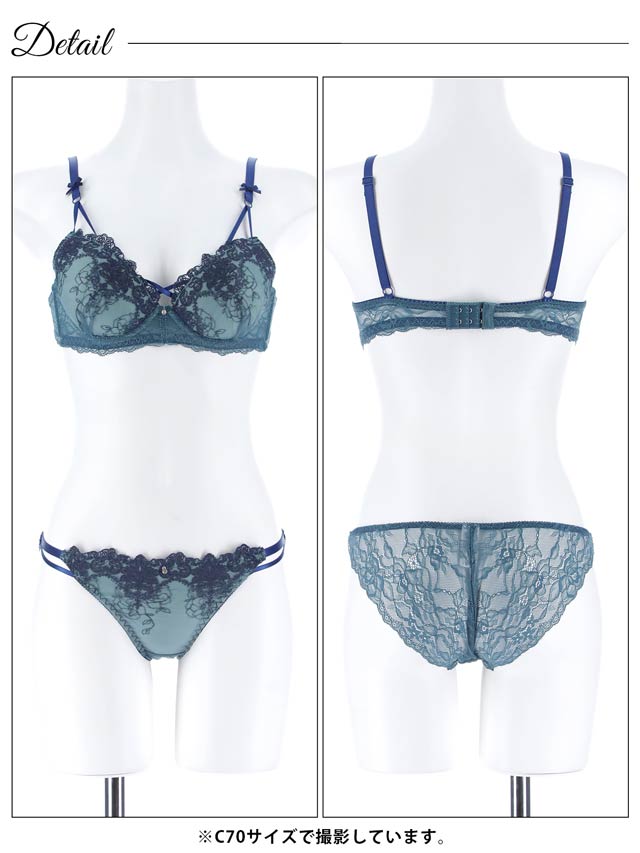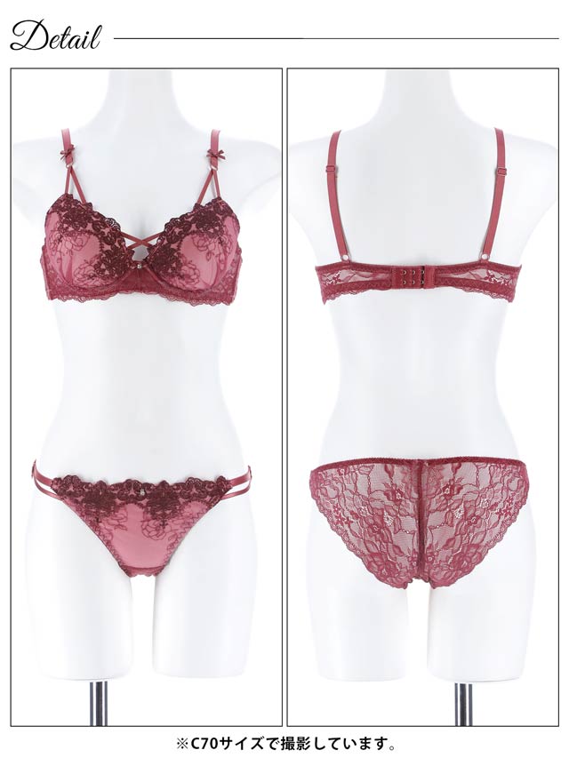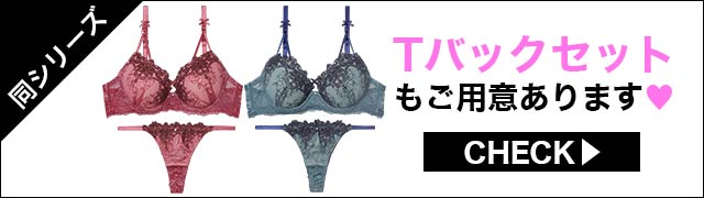 ゴシック調の刺繍と深みのあるカラーが大人の雰囲気を引き立てるランジェリー。胸元のクロスデザインで色気を感じさせつつ、ストラップにはリボンをあしらい程よく甘さもプラス♪ショーツサイドはWストリング仕様で腰まわりをすっきりと華奢に見せてくれます。