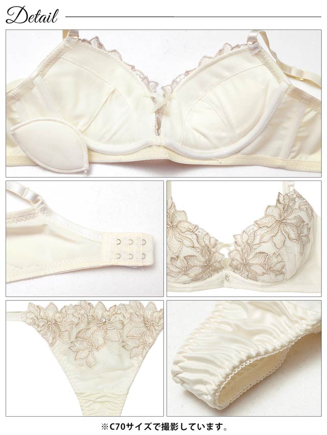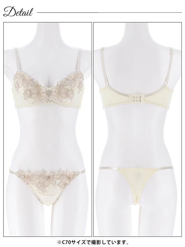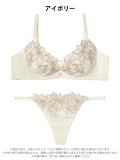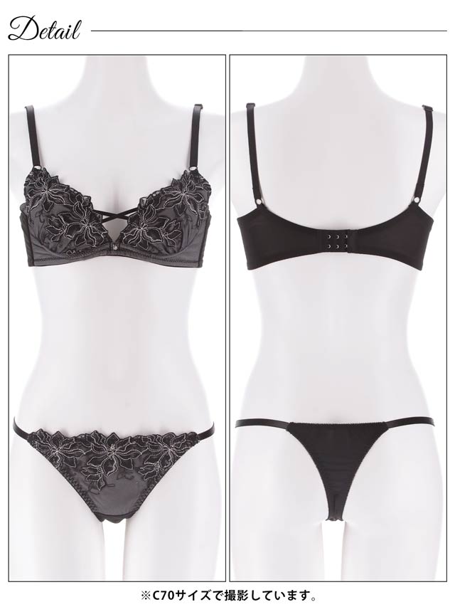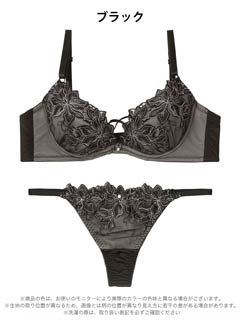 胸元を覆う花の刺繍が魅力的なランジェリー。クロスコードと縁取る刺繍が胸元を華やかに演出します。ショーツサイドはストリングラインでさりげなくセクシーな印象に♪