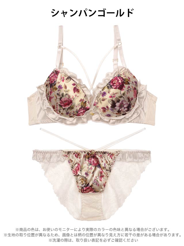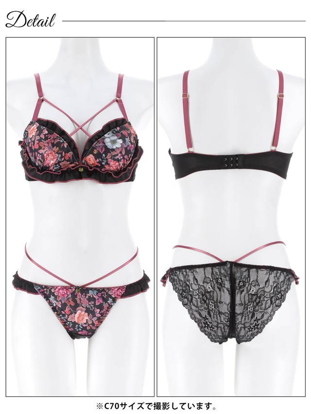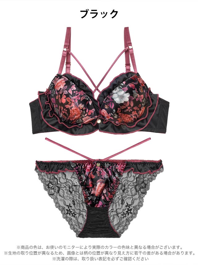 絵画のような色とりどりのフラワープリントが目を惹く華やかなランジェリー。女の子らしいフリルとセクシーなコード使いがポイント!甘さも色っぽさも兼ね備えた欲張りなデザインが魅力的◎ショーツは透け感のあるバックレース仕様で後ろ姿まで抜かりない仕上がりです♪