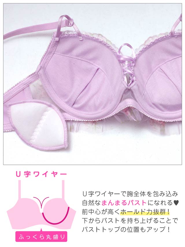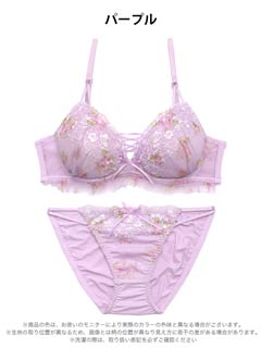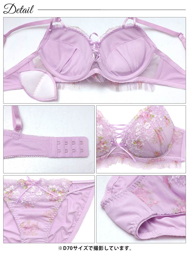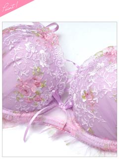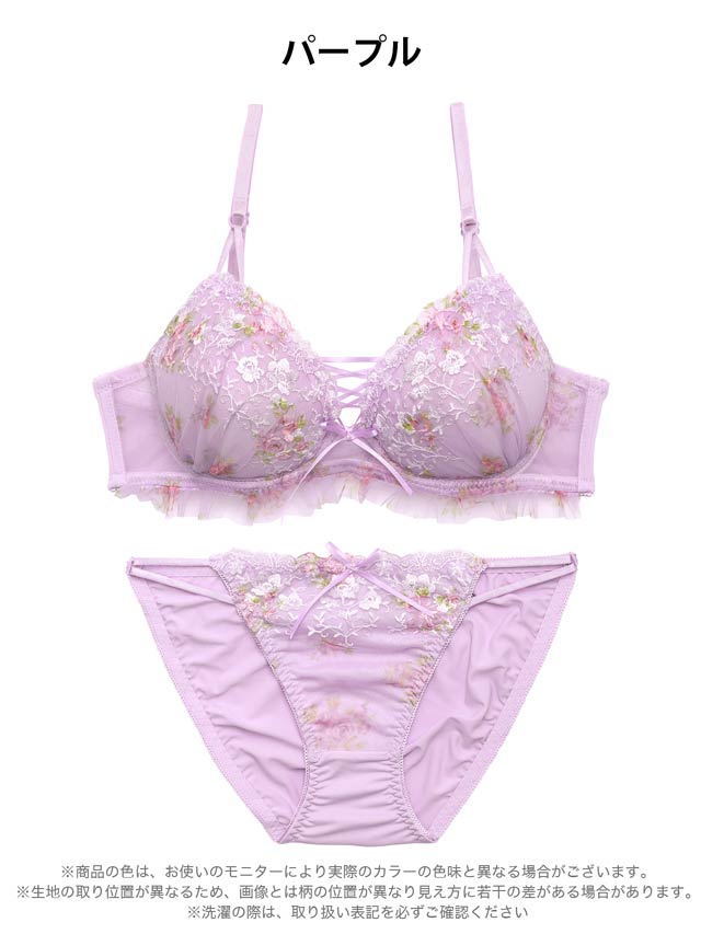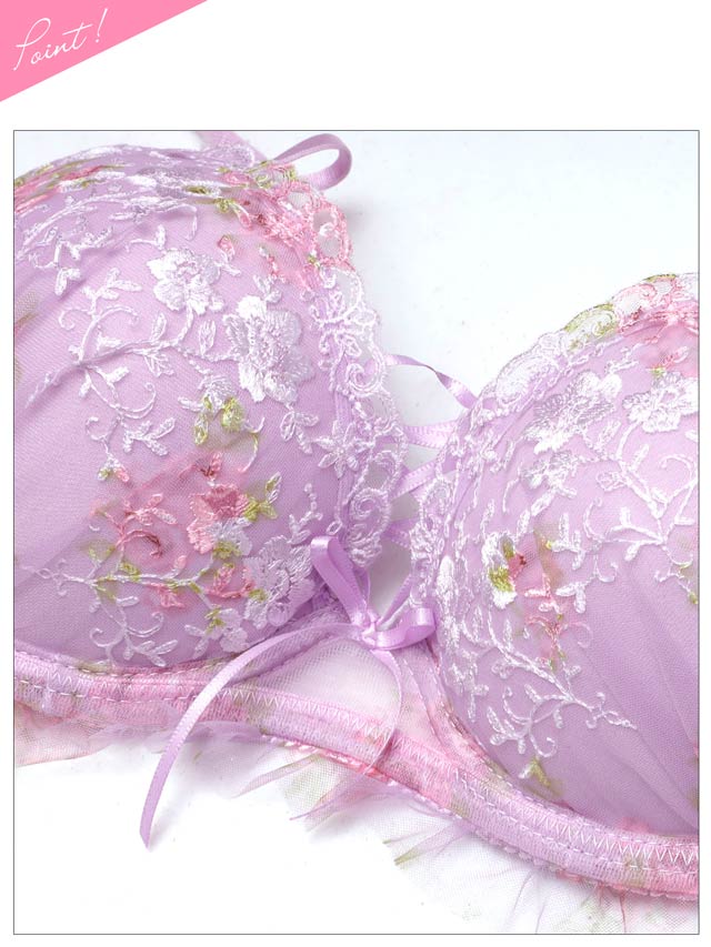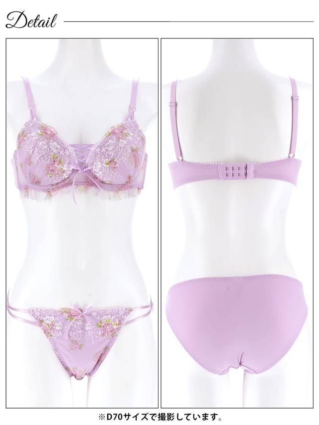 優しい色使いと可憐なフラワー刺繍が、フェミニンな雰囲気を演出するランジェリー。胸元の編み上げデザインとフリルが可愛らしさを引き立てるアクセントになっています♪ショーツはサイドのダブルストリング仕様で、さりげないセクシーさをプラスした一着です◎