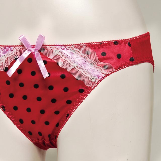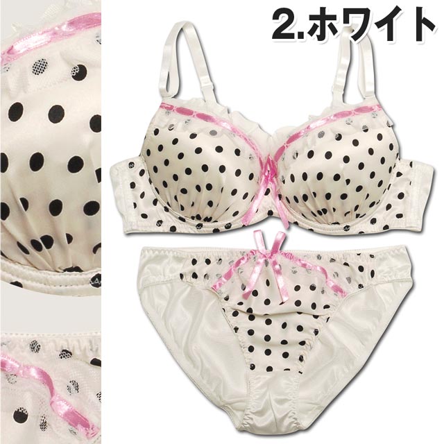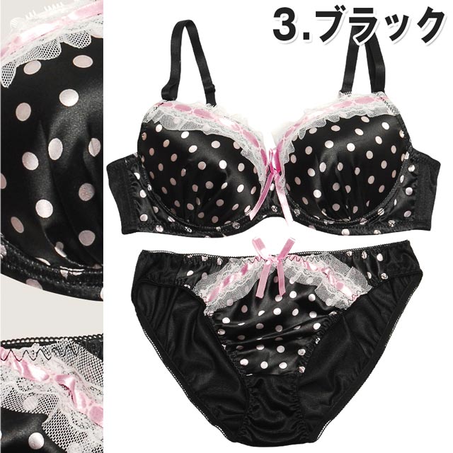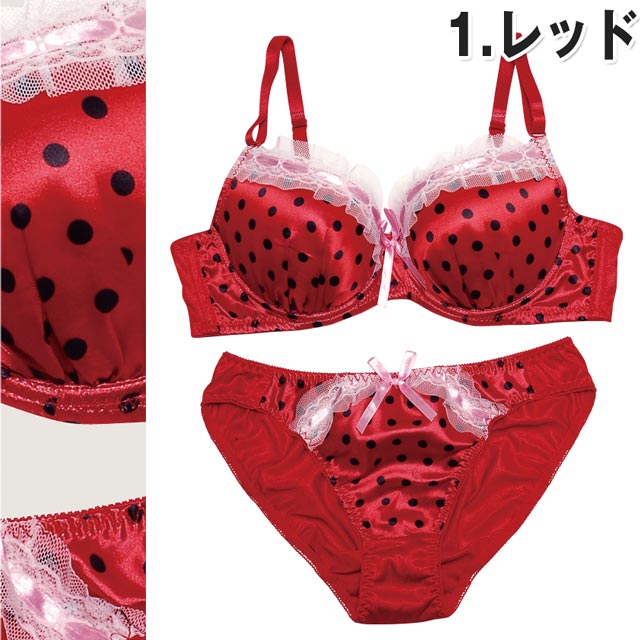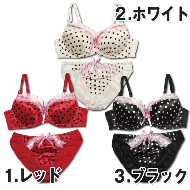 POPでCUTE☆キャンディーみたいなドット柄ブラが登場☆つるつるとしたサテン地にミニーチャンみたいなドット(´∀`)☆胸元にはレースとリボンのW使いで、華やかさがUP!リボンはcuteなピンクであま~いオーラを放出ゝ(´A`★ゝ)!パッドは付属パッドで適度に盛れちゃう♪ショーツにもドットにレースとリボンをプラしてcuteシルエの完成だよ+.゜ヽ(●´ω`●)ノ。