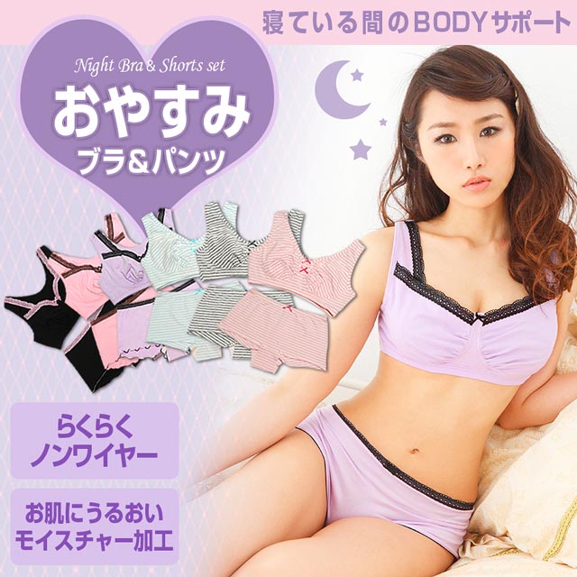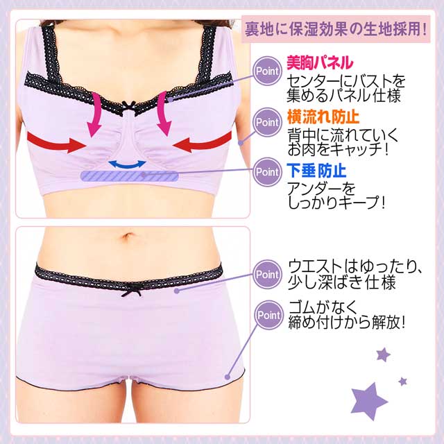 『寝てる時はノーブラ』というアナタ!!今、胸の衰えを感じている20代女性が急増中!!今からきちんとケアしましょう♪睡眠中に付けられる夜用ランジェリー☆バストをセンターに集め、背中にお肉が流れるのを防ぎ、アンダーをしっかりキープして垂れ下がりも防止!!こんなに効果いっぱいなのに、ノンワイヤーで締め付けゼロ♪ショーツも、少し深ばき仕様のゆったりウエストで超~楽ちん☆裾にはゴムがないから驚くほどストレスなく履けます♪保湿効果の高い裏地を採用し、寝ている間にもお肌にうるおいを与えてくれるモイスチャー加工☆乾燥する秋冬に特にうれしい一着です♪