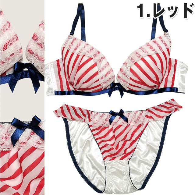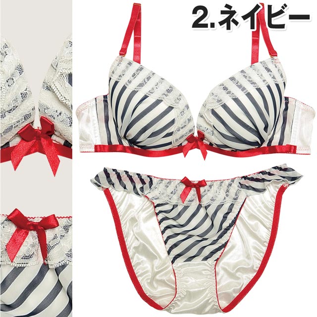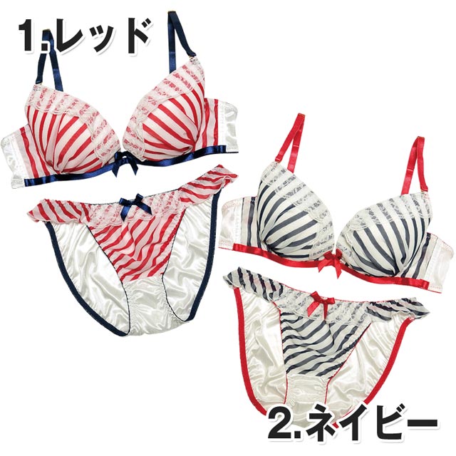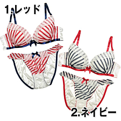 Summerを連想させる*゜+。・先取りマリンボーダー柄が登場ッ(´∀`*)素肌に映える色合いなので♪着けた瞬間からパッと★明るく可愛らしいBodyに早変わり?赤とネイビーがあなたの魅力を引き立てます?アンダーにはリボンが装飾されており、女子力もぐーッんとUPd(ゝω・*)ショーツ周りはシフォンフリルでヒラヒラ★ミ気になる腰周りもスッキリ見えます♪シフォン素材が肌にFitし+゜。・谷間を柔らかく包み込んでくれますよd(・∀・*)♪゜+.゜