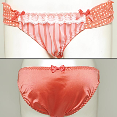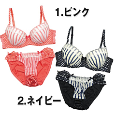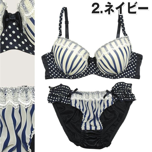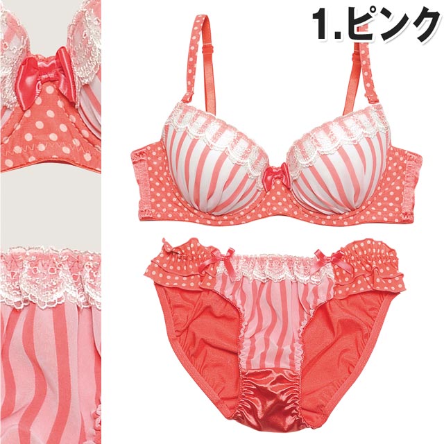 CUTEランジェから新登場☆思わず「カワイイ!!ヾ(´▽`●)ゝ」って声に出したくなるようなラブリー感♪カップはストライプ、ブラベルト&ストラップはドット柄のCUTEな組み合わせ☆胸元にはWHITEレースがッ♪センターのリボンもCUTE!!ショーツのフロントはレース×ストライプ、サイドはリボン付きの2段ドットフリルがカワイイ☆バックはリボン付きの艶やかなサテンでバックスタイルもカワイイ、コダワリのショーツだよ♪パッドはWパッド仕様なのでボリュームUPも出来ちゃう☆CUTEなブラショーをGETしてみてねヽ(*´∀`*)ノ☆