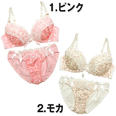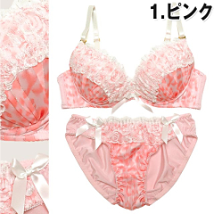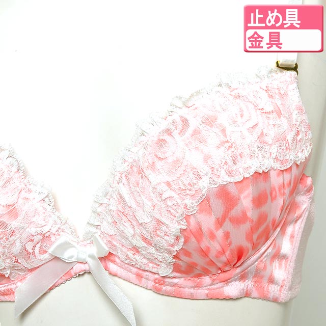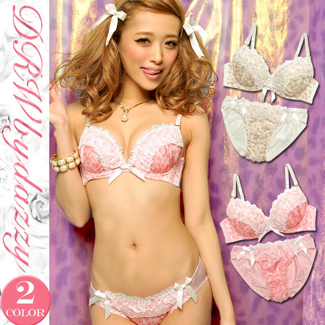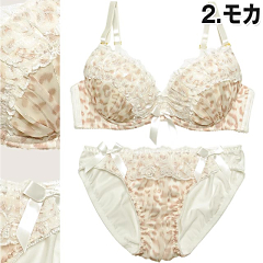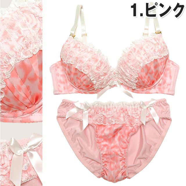 淡いレオパ柄のラメシフォン生地が優しい大人エレガントなランジェリー★+゜。・角度を変える度にキラキラ輝き☆゜:。*。カップ全体が華やかになります(*´∀`)ノまた贅沢に乗せたレースフリルや、中央のサテンリボンが上品な雰囲気を醸し出します(∩‘∀‘)∩もちろん極厚Wパッドで美谷間だってお手の物♪お揃いショーツにもフリル&フロント両サイドのリボン付で抜かりなし♪誘惑の上品レディに翻弄されっぱなし★