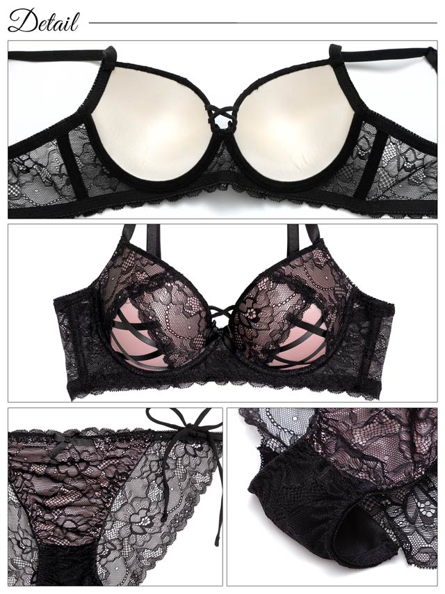 オールレースカットストリング育乳脇高ブラジャー&バック透けフルバックショーツ