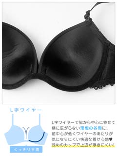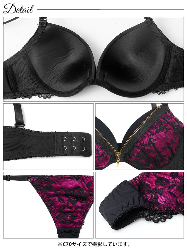 光沢のあるサテン生地×薔薇のブラックレースが色っぽいブラ。フロントのファスナーで自由自在に谷間が作れます♪直接金属が胸に当たらないので金属アレルギーの方も安心して着けられます。セットのボトムはおそろいのバックレースショーツ!