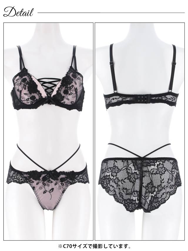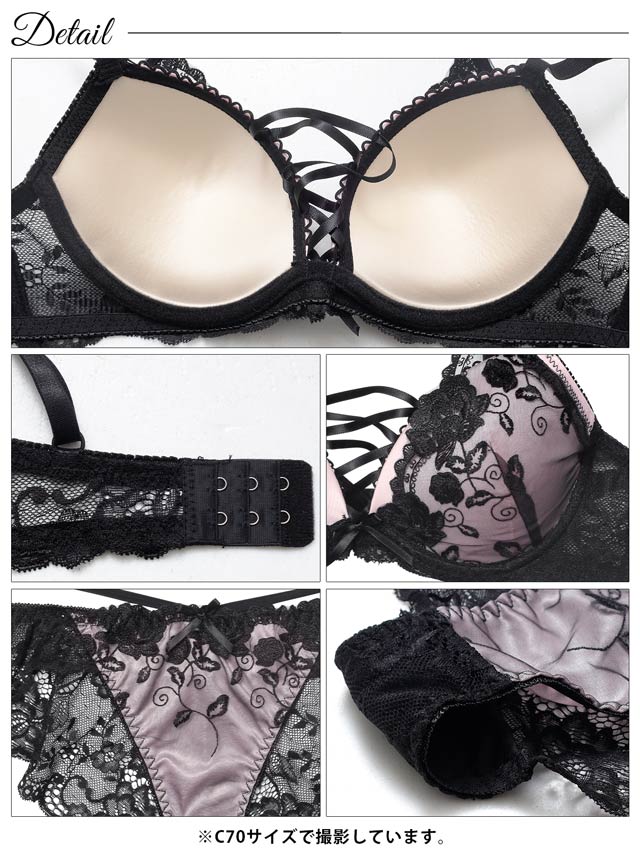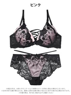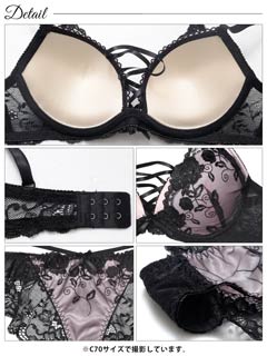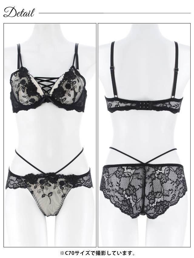 12/12新作!【EFサイズ】ノワールフラワーレースアップブラジャー&バック透けフルバックショーツ[大人気]