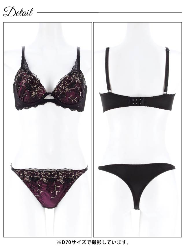 艶やかなサテンとフラワー刺繍入りのチュールレースを組み合わせた、華やかで高級感のあるランジェリー。胸元に施されたホールデザインがさりげなくセクシーなポイント。ショーツはサイドストリング仕様で、腰まわりをすっきりと華奢に見せてくれます。
