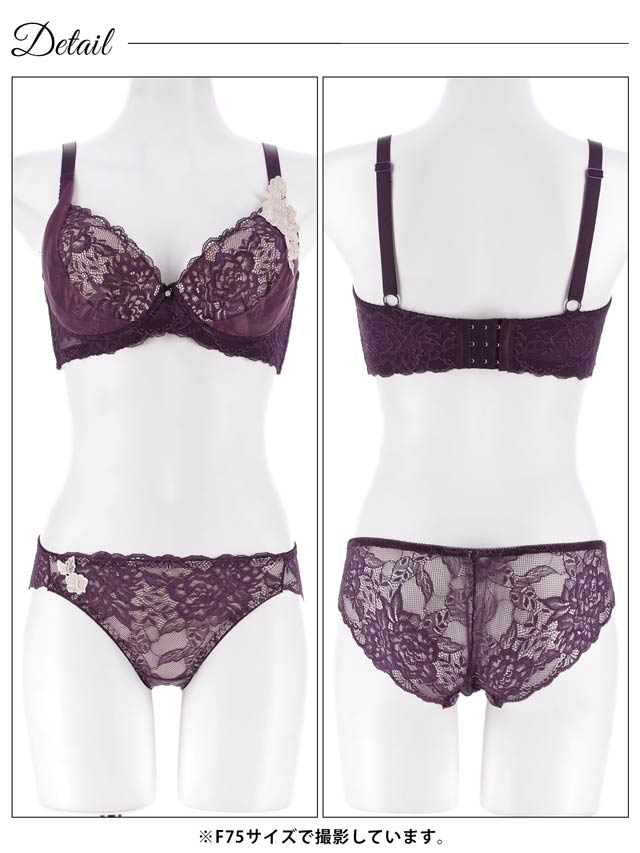 フロレゾンローズレース育乳脇高ブラジャー&サイド紐バック透けフルバックショーツ