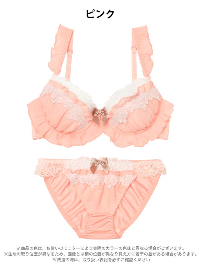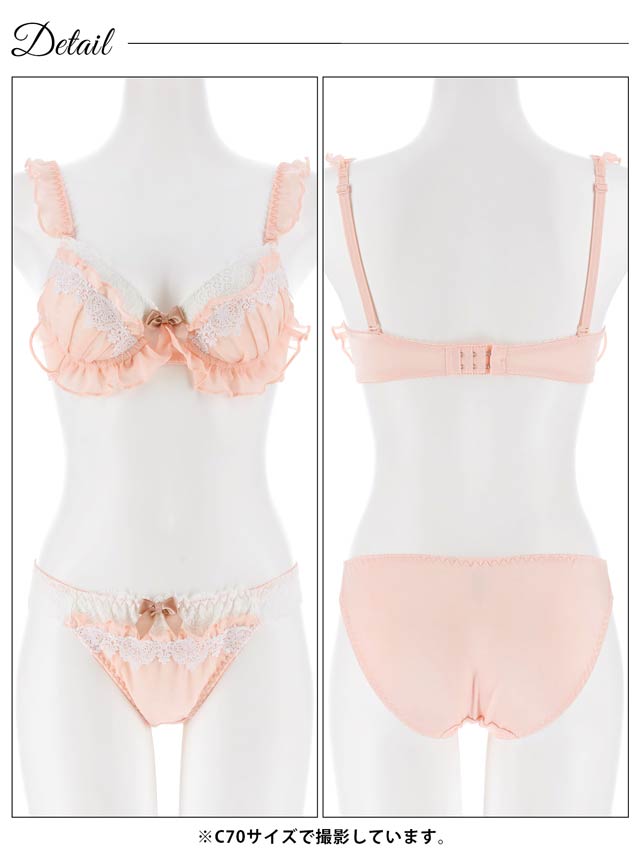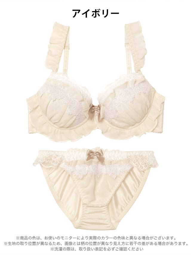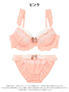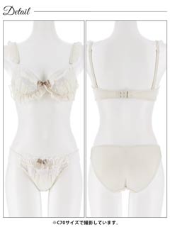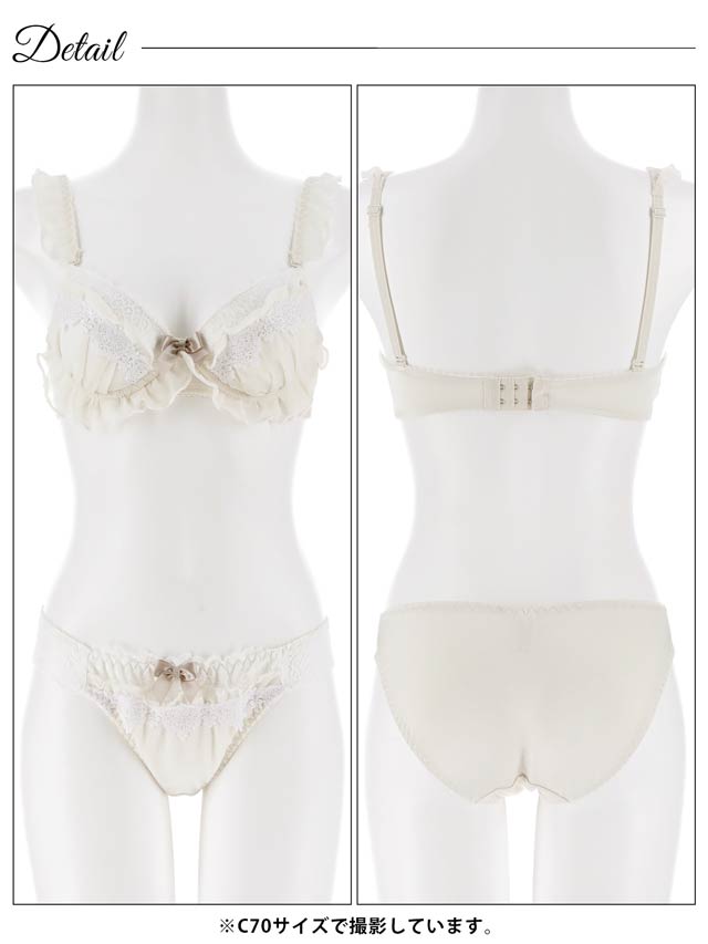 ふんわりフリルと繊細なレースがケーキのような可愛らしいランジェリー。ホイップのようなホワイトレースとワンポイントリボンがアクセントになり甘くとろける可愛さに。ショーツにもフリルとリボンをあしらい、360度抜かりないスウィートな一着です♪