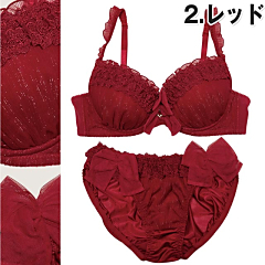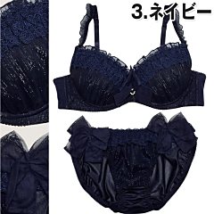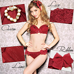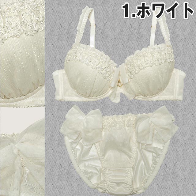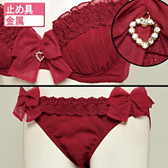 シフォン生地にラメを織込んだ特別な生地を使ったブラセット★角度によって輝く生地があなたをいつもより華やかに魅せてくれます♪カップをケミカルレースで飾って、より上品に仕上げました☆☆センターにあるチュールのリボンと揺れるハートチャームもポイント!!ショーツはレースでぐるっと1周囲んで大きなリボンを両サイドに飾りました?気品のある女に魅せたい時はこのブラセットに決まり(*^_^*)