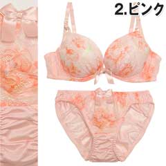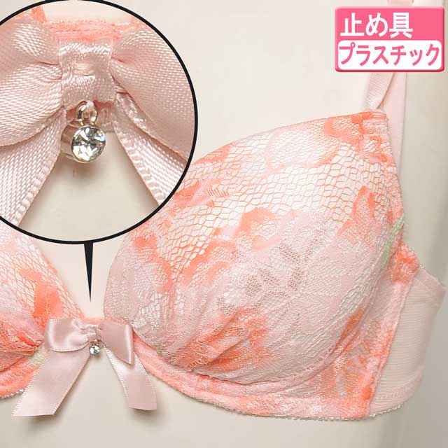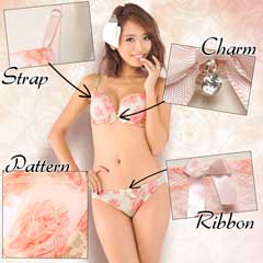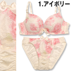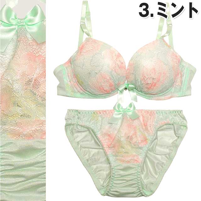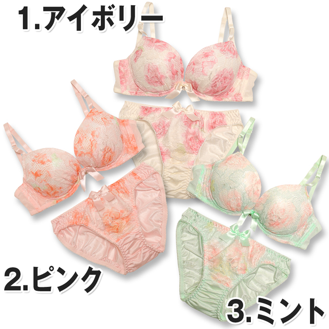 一瞬グラデ―ションに見える柄は、実はバラ模様。レースに花柄をプリントした特殊生地を使用。濃淡を生かしたプリントで、豪華なランジェに魅せてくれます☆カップの内側には取り外し可能の『三日月型パッド』付き。このパッドでぎゅっとバストを中央に寄せ集め、綺麗な谷間が完成。胸元にはサテンリボンと揺れるラインストーン付き。さらに脇のお肉をスッキリ収める『トライアングルストラップ』で安定感のある付け心地。ショーツも同柄の花柄プリントレースを使い、ヒップはストレッチの効いた生地でFIT感も抜群!!お気に入りのランジェを付けて、毎日にHAPPYをプラス♪