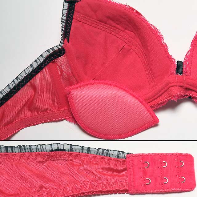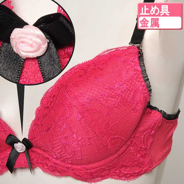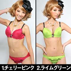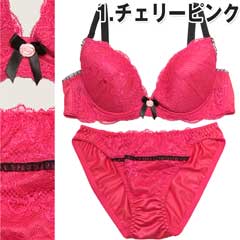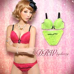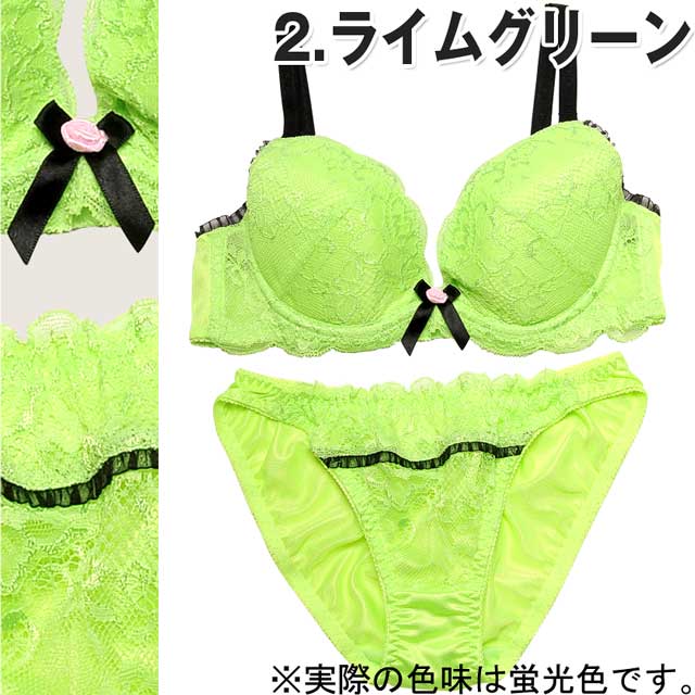 アクセントになる蛍光色の花柄カラーレースとサテンを重ねたランジェの登場です♪レースは繊細な花柄刺繍入り★ブラベルト淵とショーツにはブラックのタック入りレースを、中央に薔薇モチーフのブラックリボンを飾り、要所に黒を取り入れ、細かいディテールにこだわりました♪万能レモンパッドの強力PUSH∑で谷間にもアクセントありッ!!着ているだけで気分をアゲてくれますよ↑↑♪♪
