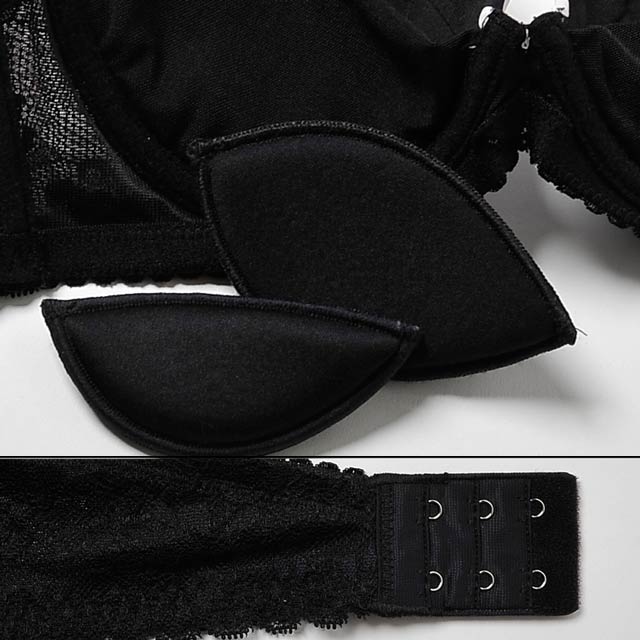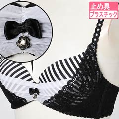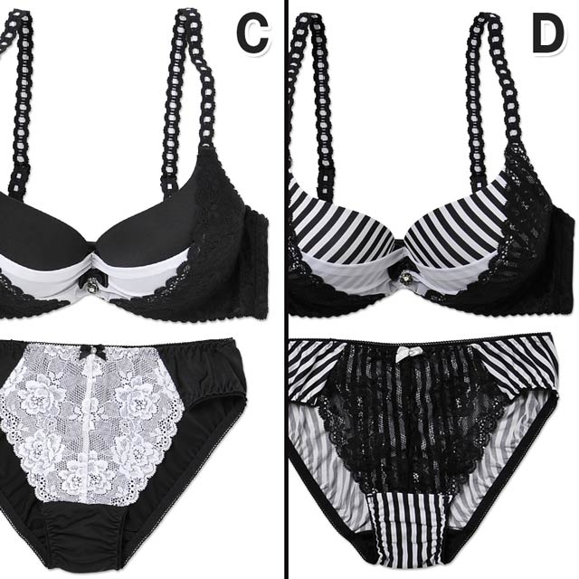 モノトーンの配色がモードな印象のブラが登場♪カップをぐるっと包んだレースは、バストを下から持ち上げグッと寄せてあげます↑さらに、薄手の内蔵パッドに付属のレモンパッド&三日月パッド仕様で、小胸さんはバッチリ谷間MAKE◎グラマーさんはパッドを調節して綺麗なバストを作れちゃいます!!フロント部分にはリボン+バラモチーフのチャーム付♪ショーツにもレース+ラインストーンがあしらわれて、高級感のある仕様です!!いつもと違う自分を演出したい時の勝負ブラとしてぜひおすすめですッ♪