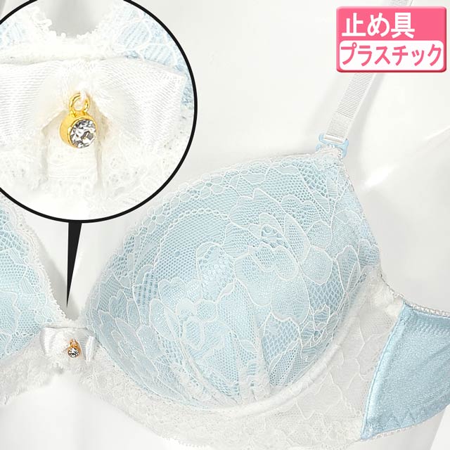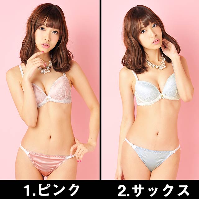光沢サテンにwhiteレースを重ねた可愛いランジェリー☆シンプルだけどレースから透けるサテンがオシャレ!フロント部分にはリボン&ラインストーンを飾りました☆ショーツは華奢な腰元に魅せるサイドの一本ラインと、ショーツバックには透けレースを採用し、ちょっぴりエッチなデザインに仕上げました♪