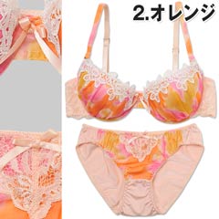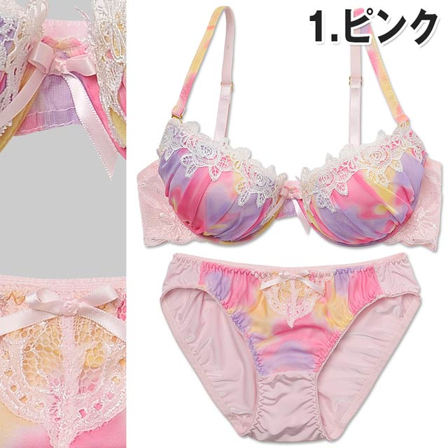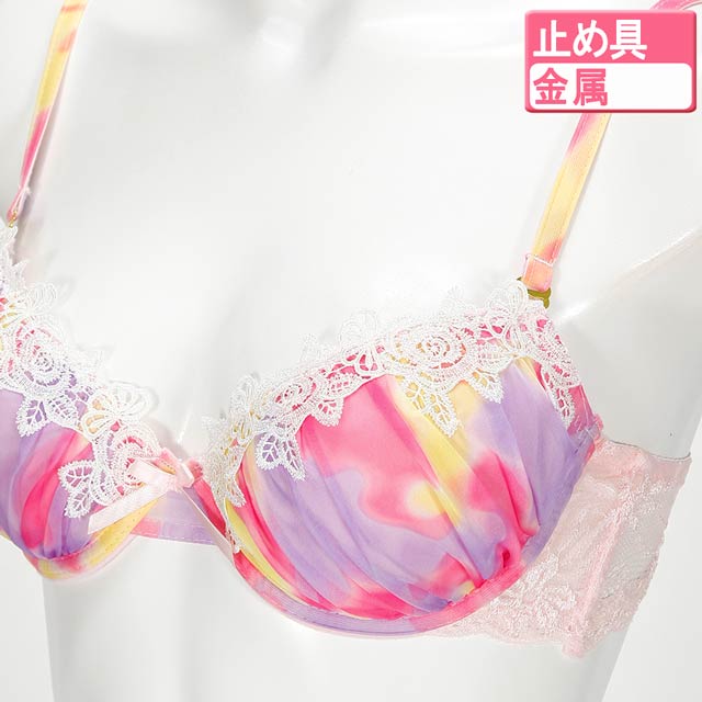 鮮やかなパステルカラーで描かれたマーブル模様がCute&オシャレな季節感溢れるランジェリー。柔らかシフォン素材に描かれたグラデーションはアナタをより一層女の子らしく、エレガントに演出してくれます♪♯゜胸元に重ねた花柄刺繍レースは谷間に視線を導き、大人の品格を漂わせるポイントに!!ブラベルトにまでレースを使用し360゜どこから見ても透ける肌にカレもうっとりすること間違い無しの贅沢ランジェリーです。
