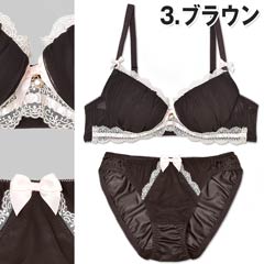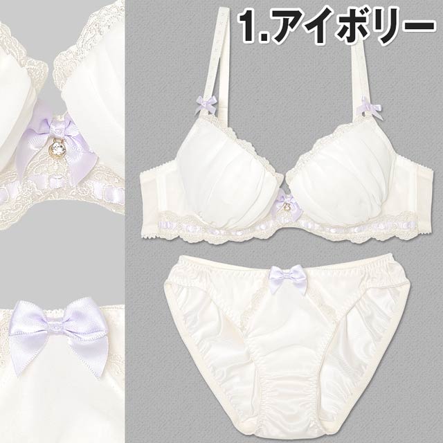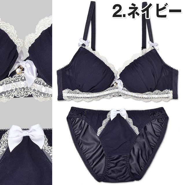 シフォン生地にレースのガーリーなランジェリーです。ブラを一周するようにレースがあしらわれ、より華やかな印象に。更にブラのフロント部分とストラップ部分、ショーツのフロント部分にはリボンが装飾されておりキュートさを演出しています。胸元のチャームで輝きも忘れませんよ♪甘いブラジャー&ショーツで彼を酔わせちゃいましょ♪