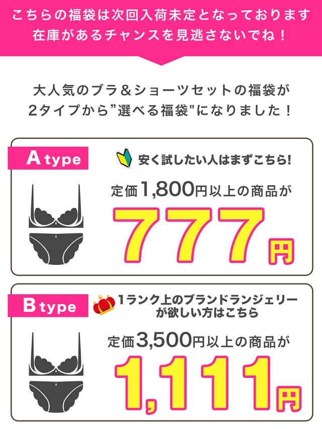 777円と激安ですが、中身は1980円以上のブランド下着や、大ヒットしたDRWオリジナル下着も、大当たりとして入っているかも!?気軽にチャレンジできるプライスなので新年の運試しをしてみては??もちろん送料無料対策にも♪