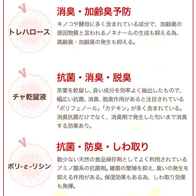 水、エタノール、トレハロース、PEG-60水添ヒマシ油、ローズマリー葉エキス、ホホバ葉エキス、ラベンダー花エキス、チャ乾留液、、ホリーEーリシン、酸化銀、BG、フィチン酸、リンゴ酸、ペンテト酸5Na、香料