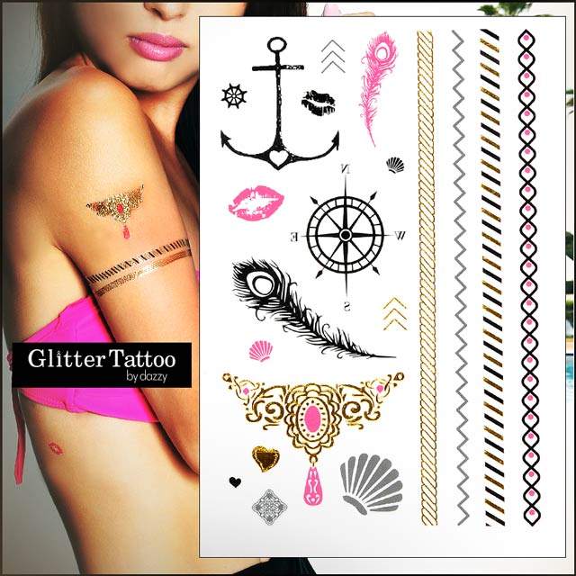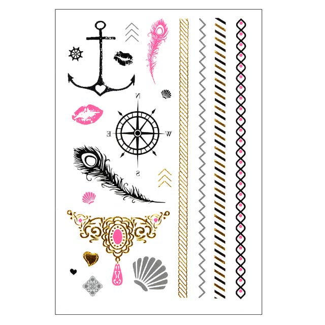 海外セレブの間ではもはや定番。モデルやブロガーの間で大流行中のフラッシュタトゥーが遂に入荷! ゴールドやシルバーにキラキラ輝くタトゥーが、夏の日差しに映える新感覚のボディシール。 水で簡単に貼れるのでアクセサリー感覚で使えるので、クラブや野外イベント、フェスやリゾートなどで大活躍!!友達とオソロ使いもオススメです!