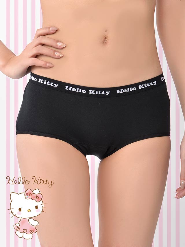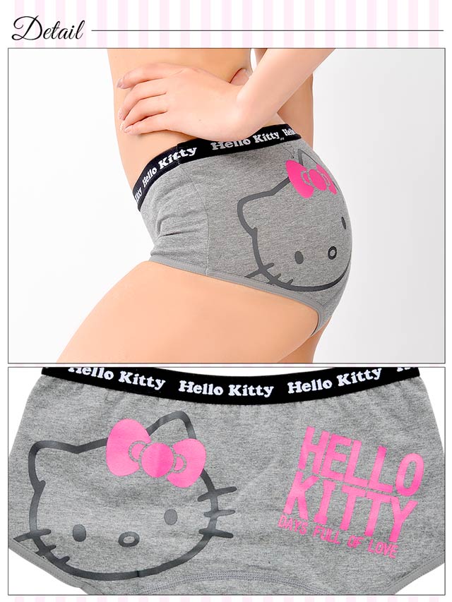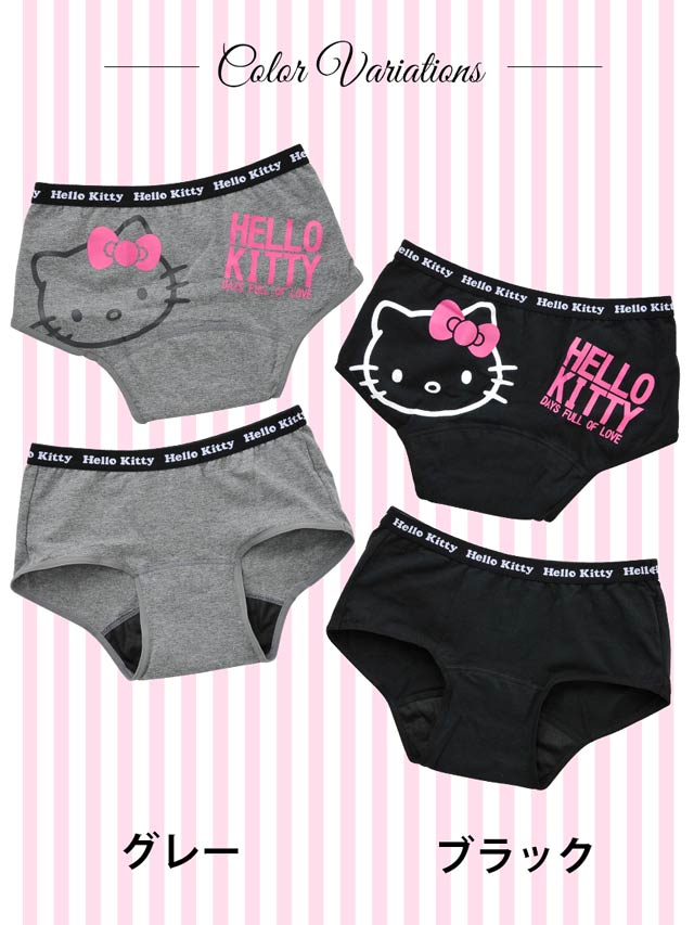 落ち着きのあるモノトーンカラーに、ハローキティをプリントしたサニタリーショーツ。ウエスト部分のロゴがほどよいアクセントになっています。綿素材で仕立てているので、伸縮性があって履き心地もバツグン!クロッチ部分は二重構造で、羽根つきナプキンもOKな内側ポケット付き。ブルーな日も可愛くHAPPYに過ごせるとっておきのアイテムです。