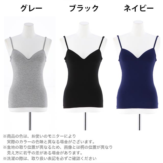 1枚でさらっと着られる暑い季節の味方!カップ付きインナーキャミソール♪カラバリはブラック、グレー、ネイビーの選べる3色展開!!内蔵カップ付きだから、1枚で着れる♪内蔵カップは少し厚めのパッドだから、ノンワイヤーなのにキレイなバストになれちゃいます☆使い勝手も良く、薄手だからお洋服に響きにくいのもポイントです!1年中、ヘビロテ間違いなしのマストバイアイテムです!