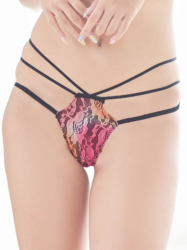 トリプルストリングが個性的なグラデーションレースTバック♪ボトムスからストリングをチラ見せしてオシャレもできちゃう万能デザイン☆バックスタイルにはクロスデザインでカワイイリボンをトッピング!!お手持ちのシンプルなブラジャーと合わせてミックスマッチデザインを楽しむのもオススメです♪