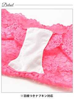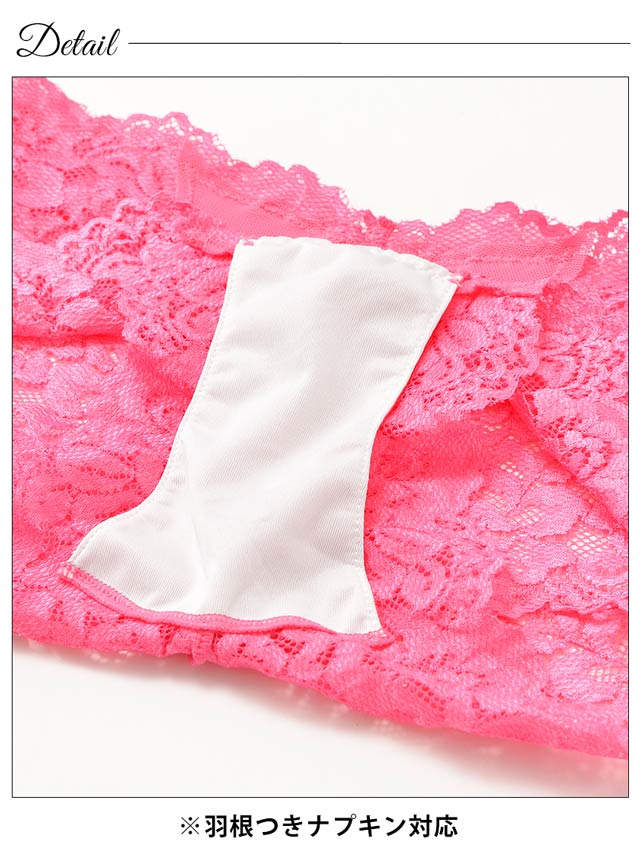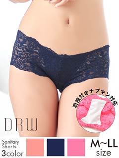 ブルーな日もオシャレを楽しめる!総レース仕立てのサニタリーショーツ。総レースで、ボトムに響きにくいのがポイント。伸縮性のあるレースで仕立ててるので、肌に優しくフィットして、食い込みが気になりません。クロッチ部は、羽根付きナプキン対応の二重構造。カラーは3色から選べます!