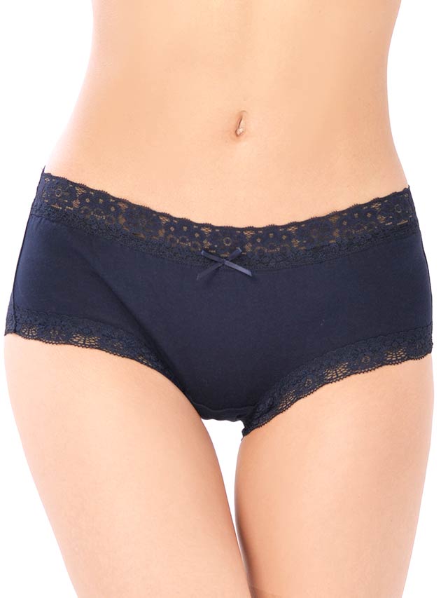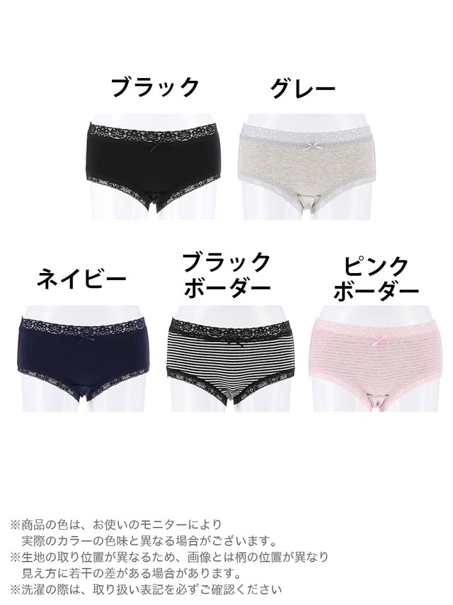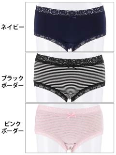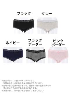 サニタリーショーツ♪デザインはシンプルな「ブラック」「グレー」「ネイビー」と、カジュアルな「ブラックボーダー」「ピンクボーダー」から選べます。サイズもM、L、LLサイズまで展開してます。股上の浅いボトムでも気にならないヒップハングタイプ。羽つきナプキンに対応したWクロッチ構造&アウターに響きにくい裾レース仕様です。