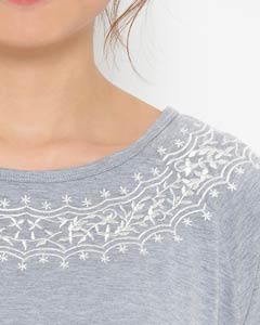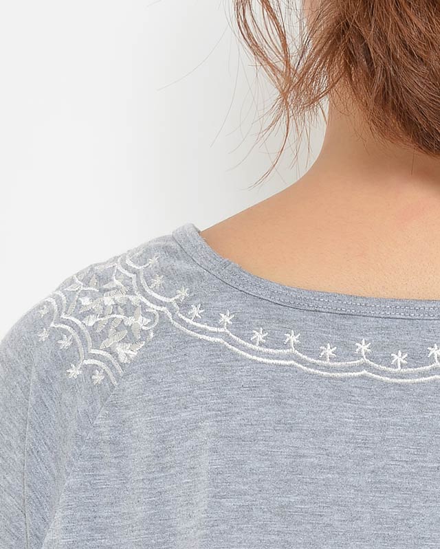 さりげない襟元のアンティークレトロな刺繍がオシャレポイントです。