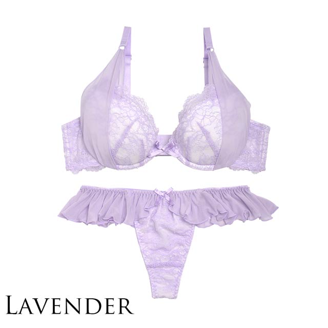 シンプルなレースに触り心地の良いチュールを重ねた美しいランジェリーです。ショーツは珍しいフリル付き。バックスタイルはちょっぴりセクシーなレース仕様なので、360度魅惑的なデザインです。カップ上にまで被せたレースはやさしくカップを包み込み、胸を横に逃がしません。大人可愛いを体現した特別なランジェリーになっています。