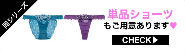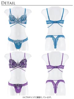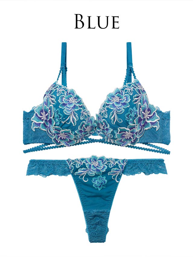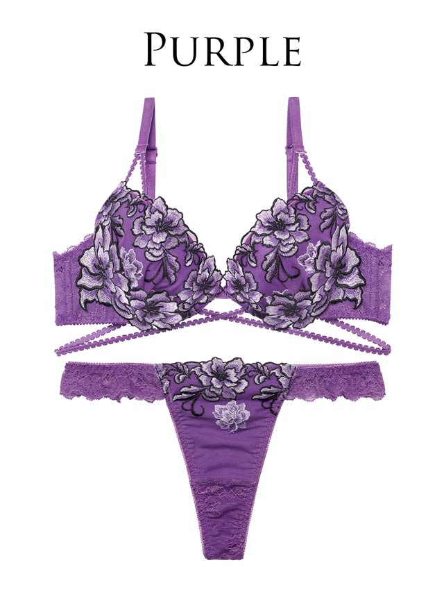 花の刺繍に覆われたグラマラスなランジェリー。大きな花は存在感抜群。背中からアンダーバストにかけてクロスしたコードが色っぽくバストを綺麗に魅せます。ショーツはバックの隙間がポイント。後ろ姿も抜かりなくセクシーにしてくれます。